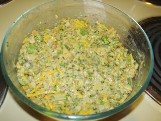 After everything was mixed together and warm I spread it on a tortilla shell and rolled it up, placing the rolled shell in a greased pan, seam side down.